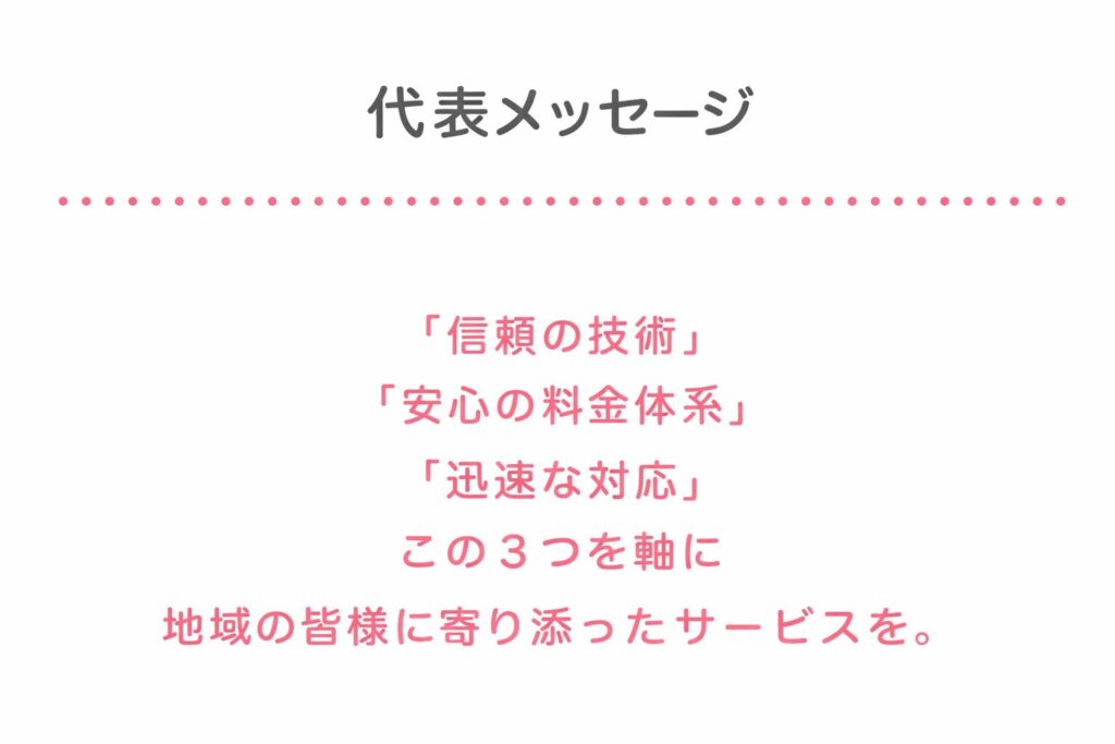 当社は「信頼の技術」「安心の料金体系」「迅速な対応」の3つを提供サービスの軸に掲げ、地域の皆様に寄り添ったサービスを提供しております。